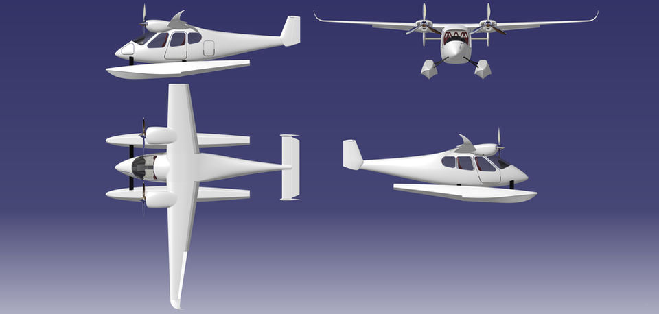 The aircraft is equipped with two 220 hp engines, providing high power and the ability to continue flying on a single engine.